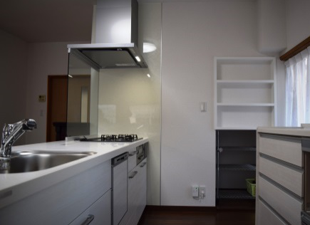 | 工事内容 | 壁付けのキッチンから対面のアイランド型キッチンへ交換した事により調理しながらLDKを見渡せるようになりました。また、間仕切を梁柱で補強しながら解体することで一段と開放的空間になりました。 |