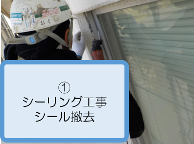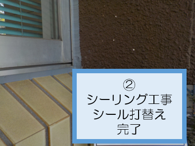 工事内容  シーリング工事ではサッシ廻りのシールの打ち替え及び目地増打シール打ちを行った。