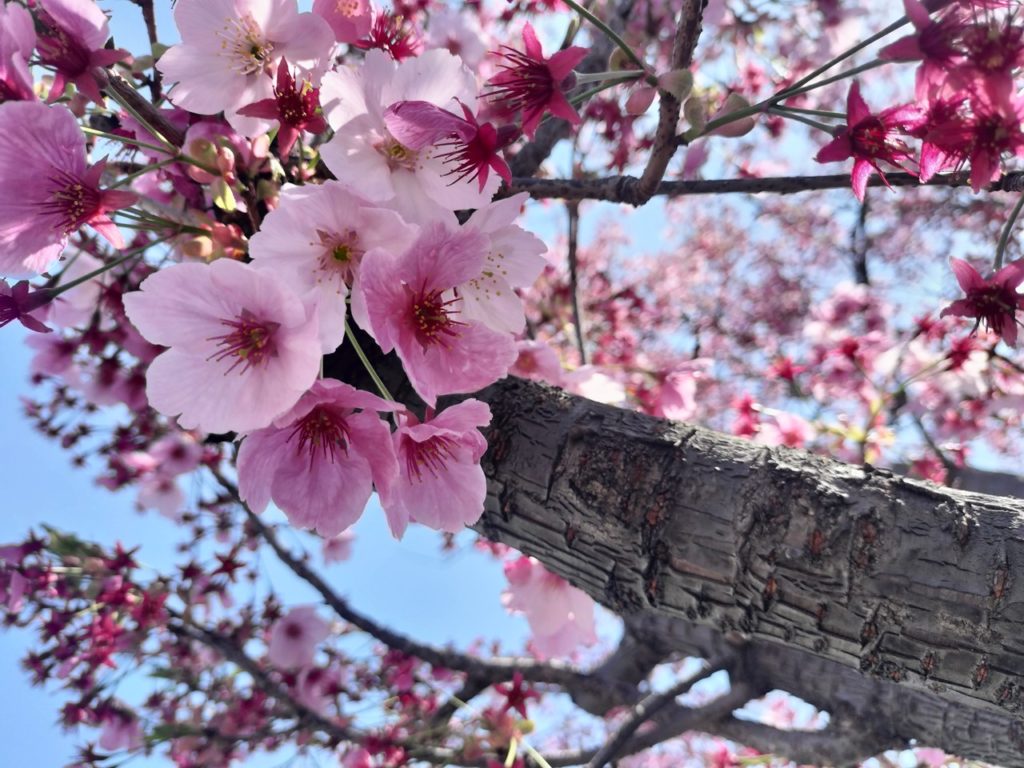 弊社の前では、陽光桜が満開を迎え、お隣のクラレさんのソメイヨシノも少しずつ花を開き始め、ピンクのグラデーションを演出してくれています。