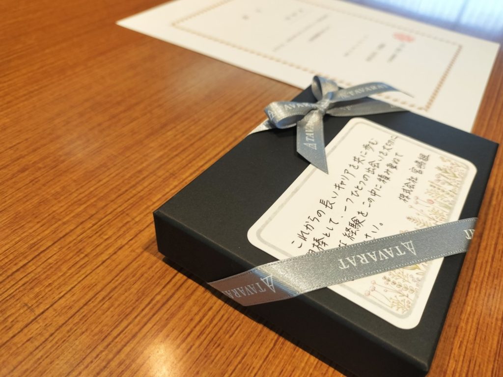 辞令と記念品を手に、笑顔と凛とした表情を浮かべる新入社員。