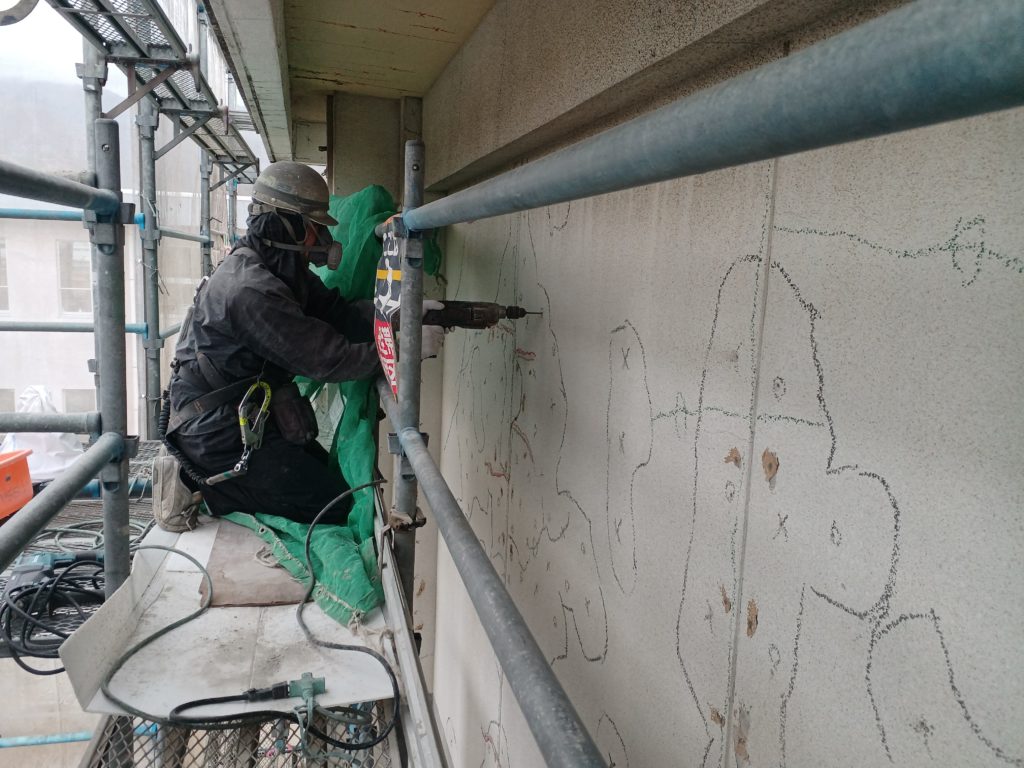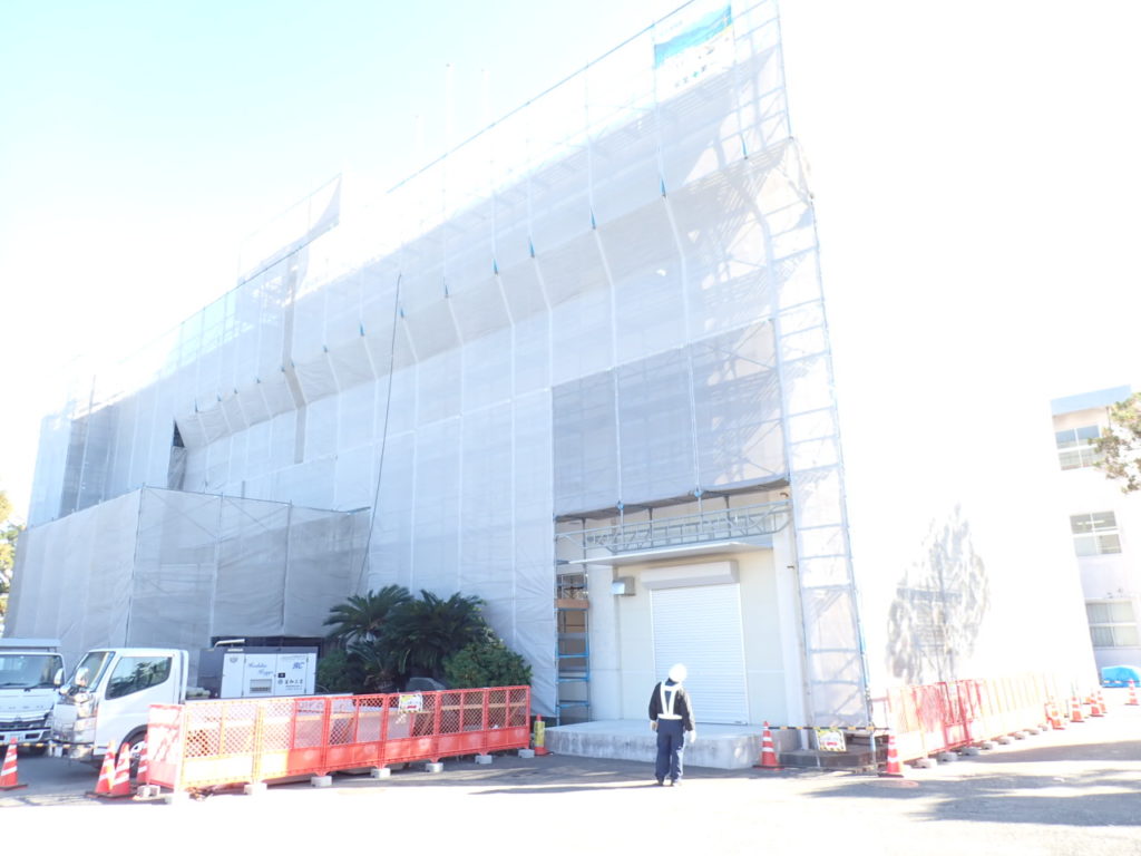 高層部まで外部足場が組み上がり、いよいよ建物の「お医者さん」のような診断と治療の工程に入ります。